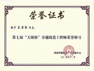 恭喜公司总经理王力夺先生荣获第七届天阳杯卓越铸造工程师称号,此次评选由国家智能铸造产业创新中心组织,经过多环节考核,王总以从业二十三年经历,在砂铸,精铸,重力和低压铸造工艺方面的研究和技术创新获得此项